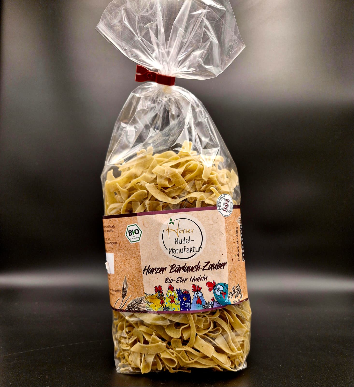 Zutaten: Hartweizengrieß, Harzer Bio-Eier (31%), 2,5% getrockneter Bärlauch, 0,5% getrockneter Spinat